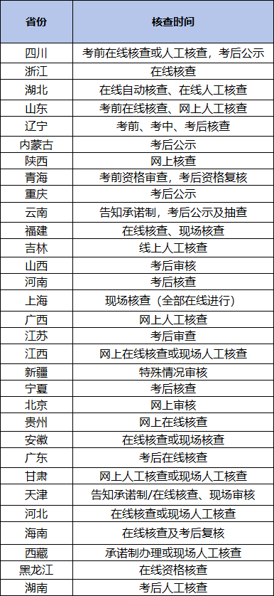 上述省份的考试核查方式详情,各地区的考生可查询当地的人事考试中心的报考公告。
